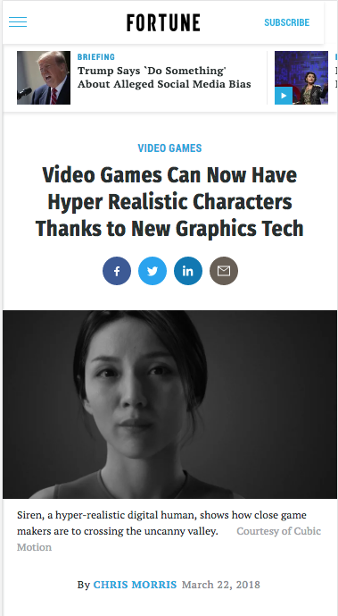 Cubic Motion was included in coverage of digital humans by top-tier entertainment and business outlets such as MSN, Rolling Stone, VentureBeat, Engadget and Fortune.